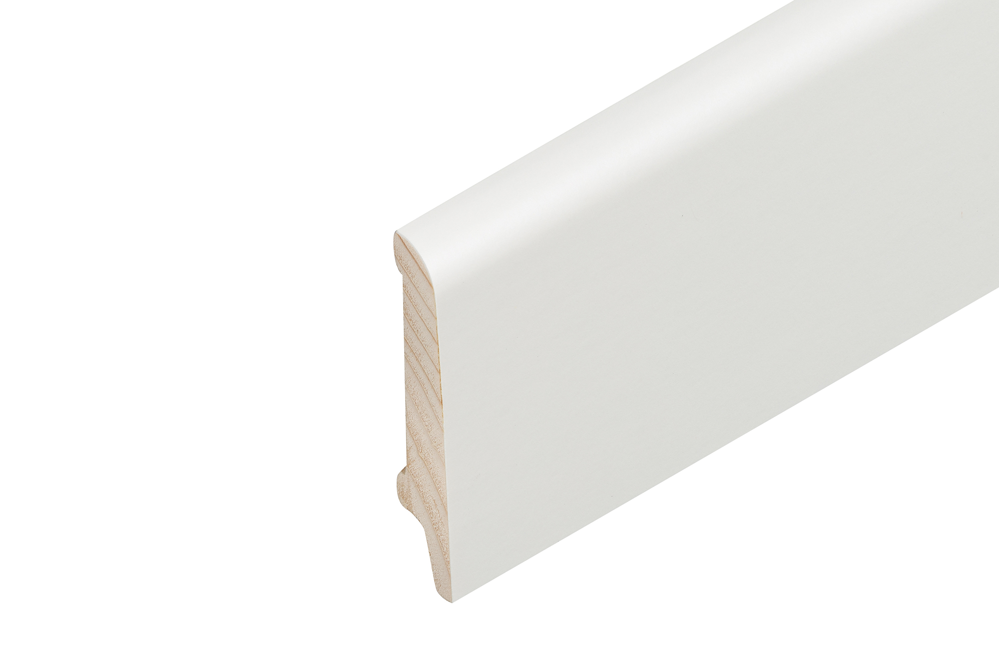 Oeko-Holzsockelleiste 60/14/8mm lackiert konisch, Echtholzfurnier ummantelt Weiss deckend RAL 9010