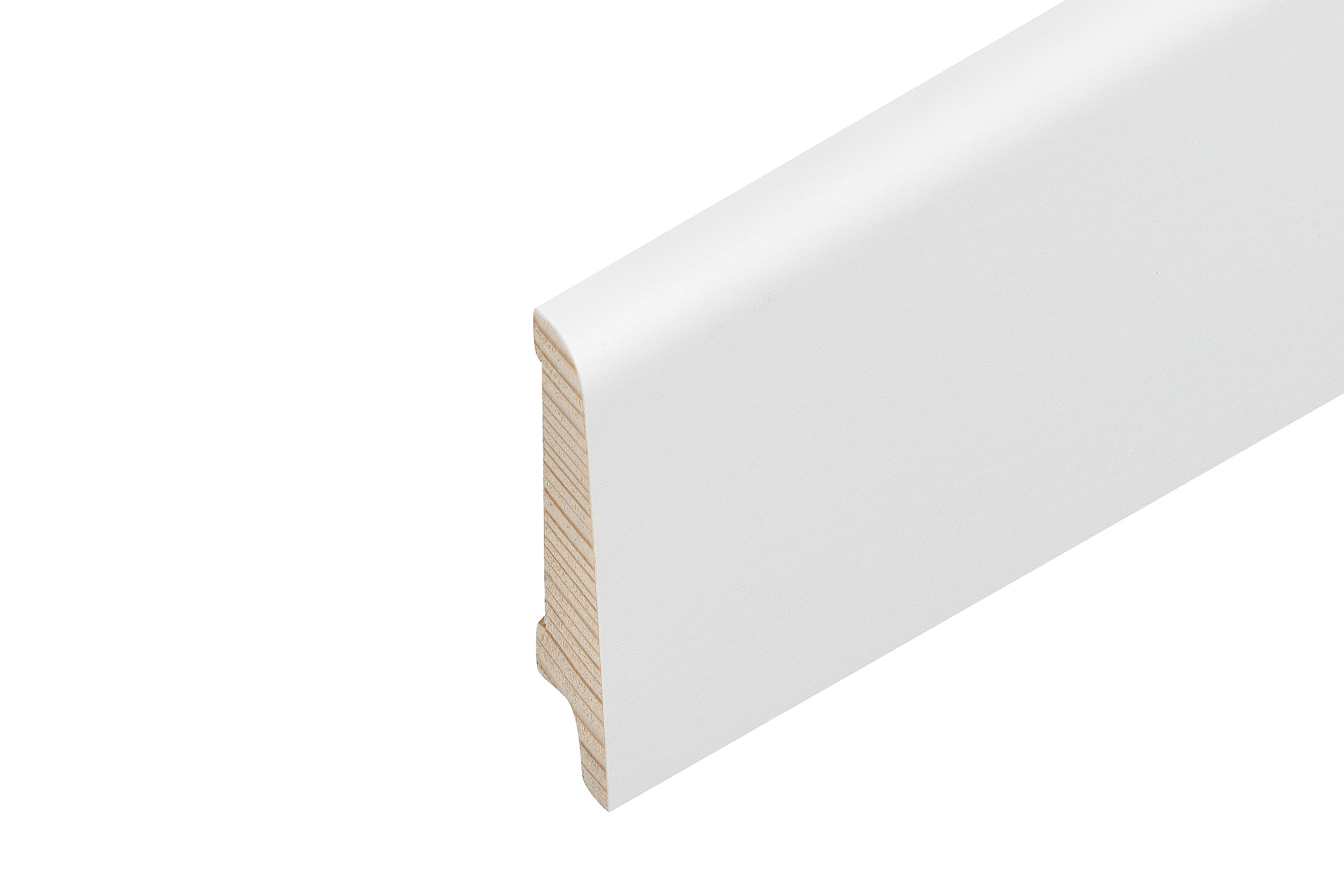Oeko-Holzsockelleiste 60/14/8mm lackiert konisch, Echtholzfurnier ummantelt Weiss deckend RAL 9016